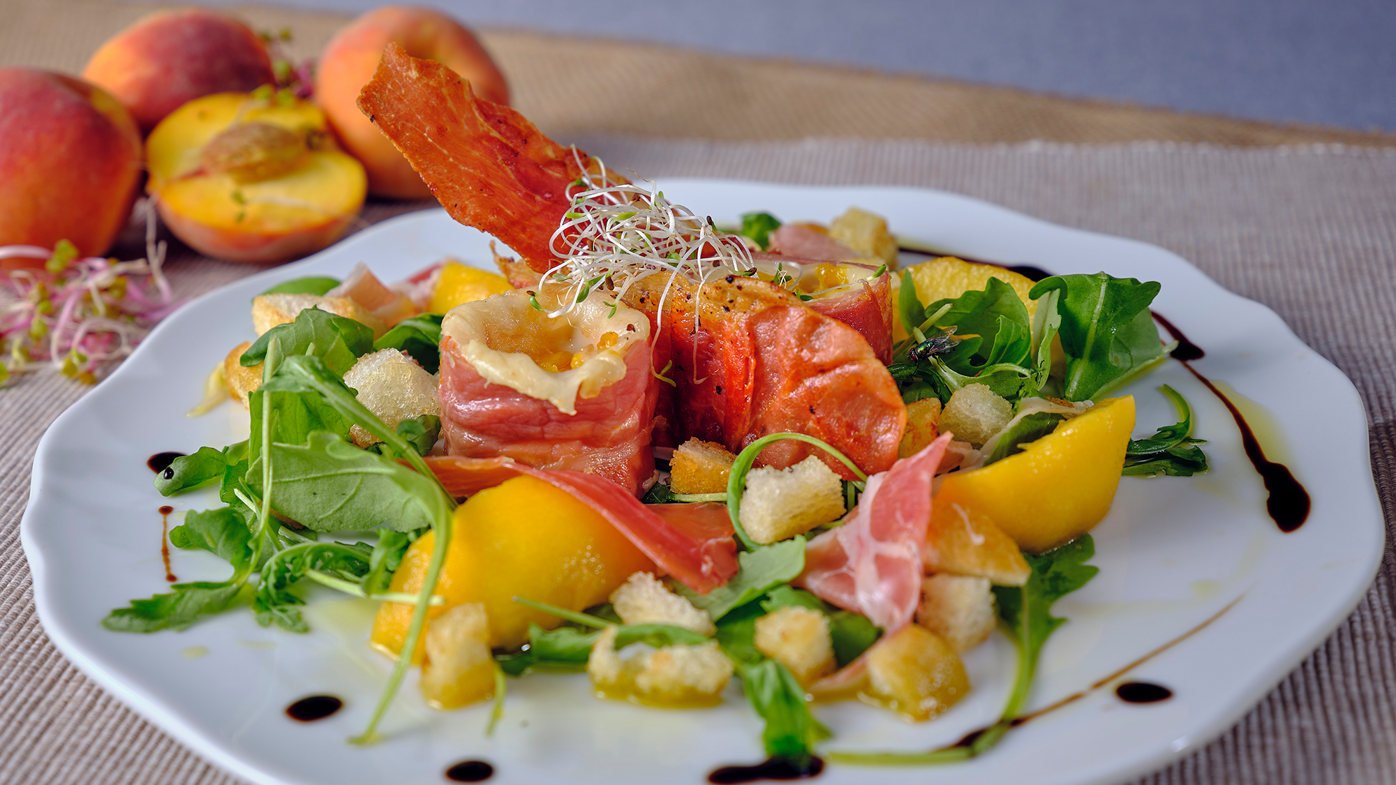 Letnia wariacja na temat klasyki — aksamitnie roztopiony ser, słodycz dojrzałych brzoskwiń i chrupiące prosciutto. Idealne na lekki obiad lub stylową przystawkę.