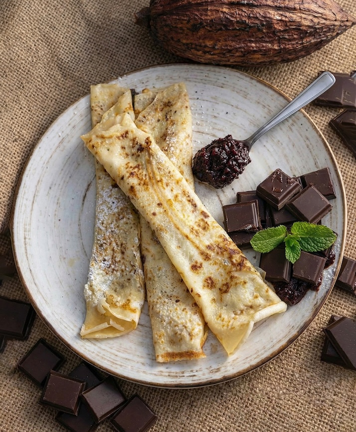 Desery Naleśniki z sosem czekoladowo-serowym Deser, który zaskakuje swoją aksamitnością i głębią smaku