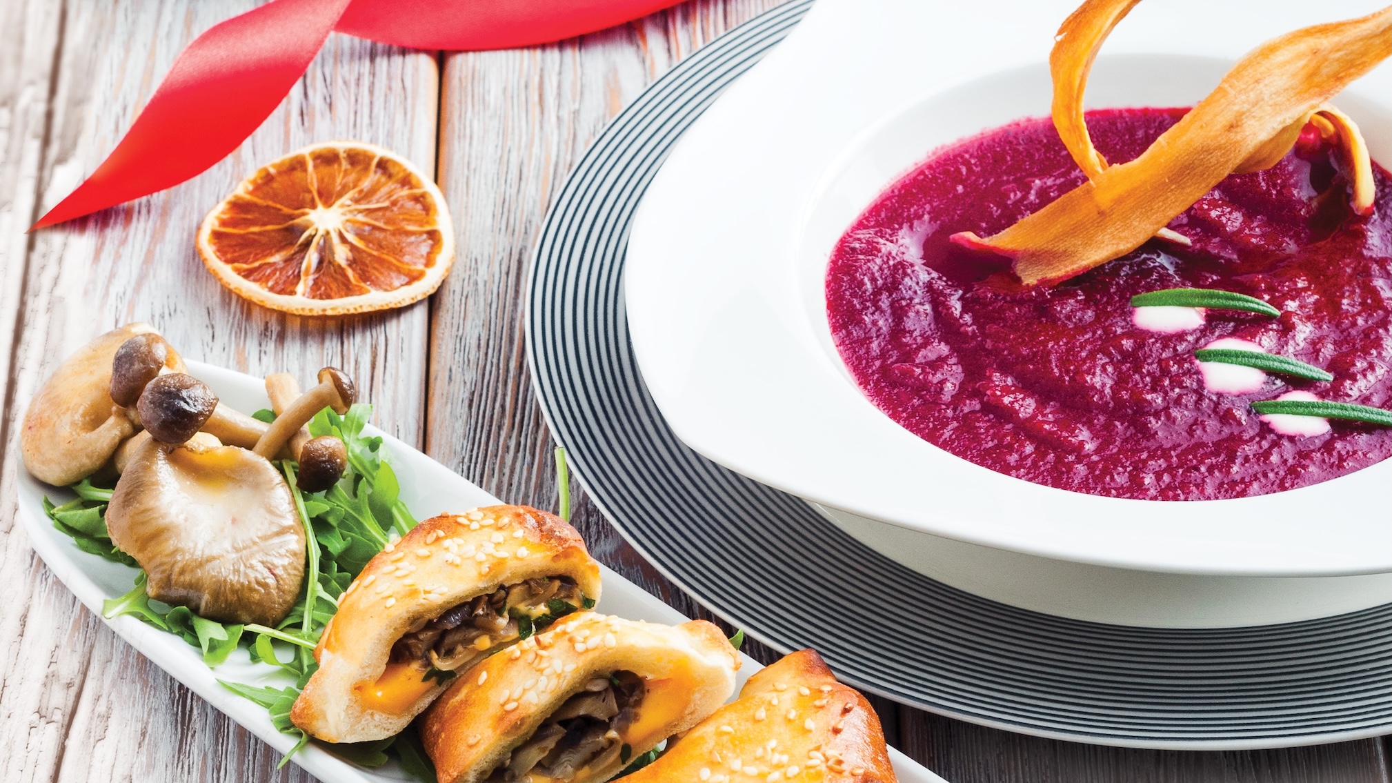 Aksamitny krem z pieczonych buraków podany z gorącymi, drożdżowymi pierożkami wypełnionymi grzybami i serem Złoty Ementaler to wyjątkowa propozycja na świąteczną kolację. To danie łączy efektowną prezentację, głęboki aromat i niepowtarzalny smak — idealne na uroczysty wieczór.
